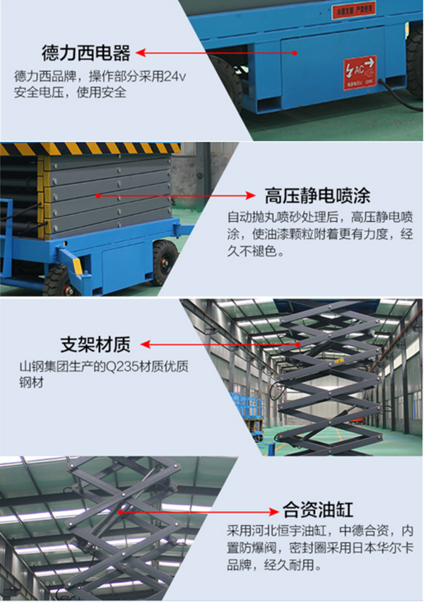 升高4——22米,載重0.3—3噸。采用意大利和國產(chǎn)液壓泵站,臺面使用防滑絕緣扣板,具有防滑,絕緣、安全,請放心使用。它使高空作業(yè)效率更高,安全更保障。